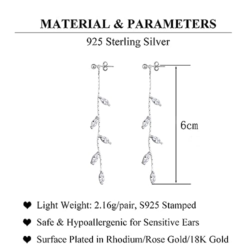 Material: Sterling SilverMetal type: Sterling SilverBack Finding: Push BackEarring design: DangleGem type: Cubic ZirconiaMATERIAL: These elegant dangle earrings are made of real 925 sterling silver with S925 stamped, not only the earrings post, but the whole earrings are made of 925 sterling silver, which really makes the whole earrings nickel free, lead-free, hypoallergenic, and don't cause any allergic reaction and donβt turn your skin green.SURFACE PLATING: These elegant dangle earrings main material is 925 sterling silver, the surface is electroplated with genuine rhodium/18K gold/rose gold so that it is not easy to oxidize, it has a good antioxidant effect to increase the service life, Also various colors of fashion dangle earrings to meet with different needs!PRODUCT PARAMETERS: The earrings total length is 6cm(2.4), the whole earrings weight is 2.16g/pair, these earrings all come with silver clean cloth in a pretty gift box stamped SLUYNZ.PRODUCT FEATURE: The slender chain with clear stones, like the olive leaves, dazzling and lovely, perfect for wedding engagement. You can wear it as the dangle earrings chain, or wear only the cute ball studs, or make it the cz chain match your other pretty studs earrings.IDEAL GIFT: Elegant and beautiful earrings for women, beautifully packaged and ready for gift-giving. Perfect Birthday Cocktail Party Holiday Anniversary Wedding Engagement Christmas Gift for the one you love.DESIGN & MANUFACTURE & SALES: SLUYNZ has our own design team and factory, focus on Design and Development of 925 Sterling Silver Jewelry in superior, especially Fashion Earrings. Whether it is the Price, Quality or Aftersales can be assured to buy.
