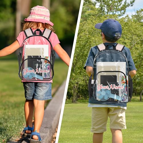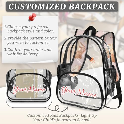 PERSONALIZED CLEAR BAG: Each clear backpack strap is printed with exquisite patterns. Various patterns are available for you to choose from. Please click the Customize Now button and enter the name you want to customizeLARGE CAPACITY: Dimensions 10.8'' x 4.7'' x 14.2''(L x W x H). Spacious main compartment. Includes 1 dedicated laptop compartment. Front zippered organizer for small items. 2 side mesh water bottle holder pocketsSEE THROUGH BACKPACK: This custom clear backpack is made of first-class thickened waterproof PVC plastic. Tear-resistant, strong, durable and smooth. Transparent design makes it easy to view the contents inside and helps to find items quicklyREINFORCED PADDED STRAPS: Thisclear plastic backpack is designed with reinforced stitching and adjustable shoulder straps. Ensure the shoulder straps are firmly fixed. Reduces pressure on the shoulder. Provides lightweight comfort and durabilityWIDE USE: This clear backpacks for adults are suitable for festivals, attending sporting events and concerts, traveling, work, gym, sports, beach, pool, camping. It can be used as a travel backpack, casual daypack, work backpack and more Perfect for everyday use. High quality materials and excellent craftsmanship ensure long-lasting durability.