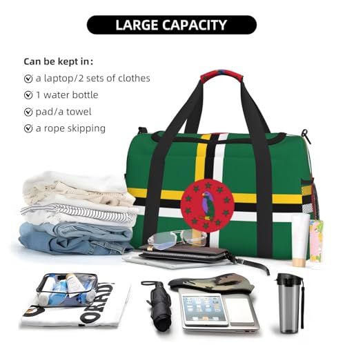 Product Features: Our Flag of the Commonwealth of Dominica printed handheld crossbody travel bag is crafted from durable twill fabric, featuring a trendy design specifically tailored for long-distance travel and daily use.Large capacity: This backpack has a spacious interior with multiple storage compartments, ensuring you have plenty of room to store your essentials during your exciting vacation.Accessory construction: 1 main pocket, double zipper, 1 internal zipper pocket, with shoulder strap, adjustable range 70-120 cm, hand strap length approx. 65 cm, reinforced webbing on both sides, buckle connection, and two mesh pockets on both sides.Versatile: Ideal for travel, weekend/overnight trips, sports activities, tennis, fishing, hunting, and many other outdoor activities. Suitable for sports and fitness bags, travel luggage bags, travel bags, handbags, weekend bags, personal items bags, and more.Note: Our Flag of the Commonwealth of Dominica printed handbag can be washed by hand but not in a washing machine. Please do not iron or bleach it. Due to differences in measurement methods, a margin of error of 1-3 cm is considered normal for this size. Perfect for everyday use. premium materials and excellent craftsmanship ensure long-lasting durability.