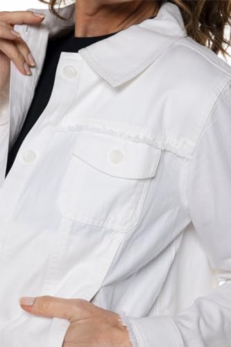 • FEATURES: Hits at high hip, frayed edge details, long sleeves, two chest pockets with button closure, two discrete on-seam pockets at waist level, button closure at front.