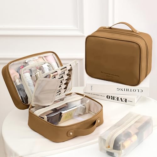 Large Capacity: Our travel makeup bag has multiple storage zones.1 waterproof and transparent large compartment, 1 zippered mesh pocket, 1 transparent and stain-resistant TPU zippered pocket, 1 separate makeup brush organizer panel. Help you categorize and organize as needed, makeup supplies, skin care products, beauty tools are all in order.Portable & Perfct Size : 10.24''L x 7.48''W x 4.53''H. This size is also perfect to put in a suitcase. Makeup bag is easy to carry with a durable handle on top. Ideal for business trips or travel vacations.Premium Material: We choose delicate, soft yet wearable leather to make this cosmetic bag, which looks very high-class. It does not absorb moisture, is tough and feels like cream to the touch. first-class double-way zippers make this cosmetic bag easy-pulling. Fabric without odor, ready to use when you receive it.Convenient to Use: The lay-flat opening design of this cosmetic organizer solves the toughest clutter problem. Keeps your large and small beauty supplies and various tools clear. No more fumbling with your makeup anytime, anywhere.Travel Must Haves & fashionable gifts: This stylish and minimalist makeup travel bag is great travel accessory and a perfect gift for mothers, wives, girlfriends, daughters, friends and even brides on weddings, Christmas, birthdays, anniversaries, Mother's Day and Valentine's Day. Perfect for everyday use. High quality materials and excellent craftsmanship ensure long-lasting durability.
