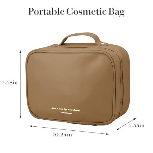 Travel Makeup Bag Large Capacity Cosmetic Organizer Waterproof Leather Toiletry Bag with Brush Holder and Handle Portable Cosmetic Storage Bag for Women Girls Gift - Brown