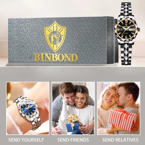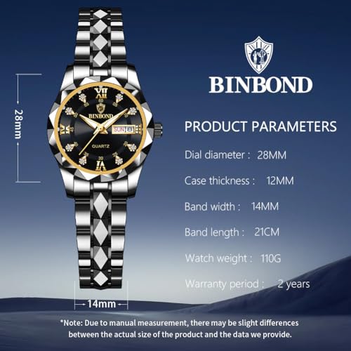 Clasp type: Double Locking Foldover ClaspItem type name: Dress Watch💖Luxury Dress Watches for Womens:Using original movement, accurate and stable travel time, quality assurance. Light luxury womens watches are suitable for any style of clothing and show the charm of women.💖Fashion Elegant Ladies Small Watch:Diamond roman numeral scale dial with day date window. Rhombus bezel, rhombus band, carefully designed to create a simple, casual and practical ladies watches.💖Stainless Steel Women Watch:The stainless steel strap is polished layer by layer to maintain luster and durability. Double safety folding buckle, comfortable and convenient to wear. We provide with Free Adjust Tool,watch strap can be easily adjusted and dismantled.💖Waterproof Luminous Function:100 feet (30M) deep waterproof, there is no problem in contact with water in daily life. HD luminous coating display, short absorption time, long luminous time, and the watch time can be clearly seen at night.💖BINBOND Brand Women's Wrist Watches:Offered in stunning gift box packaging, it is the perfect gift for your girlfriend, wife or mom. If you have any questions about your watch, please feel free to contact us and we will be happy to serve you. Perfect for everyday use. first-class materials and excellent craftsmanship ensure long-lasting durability.