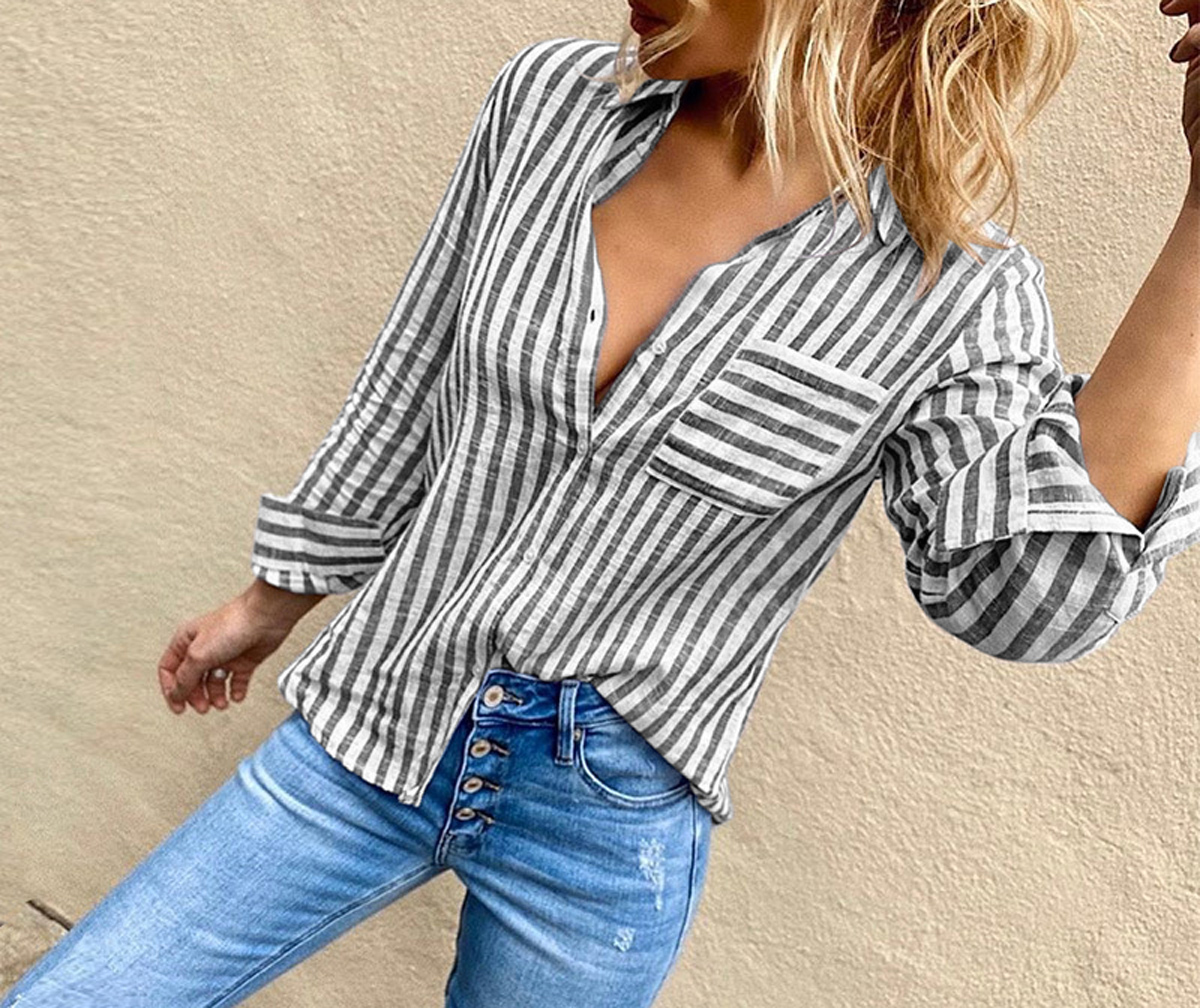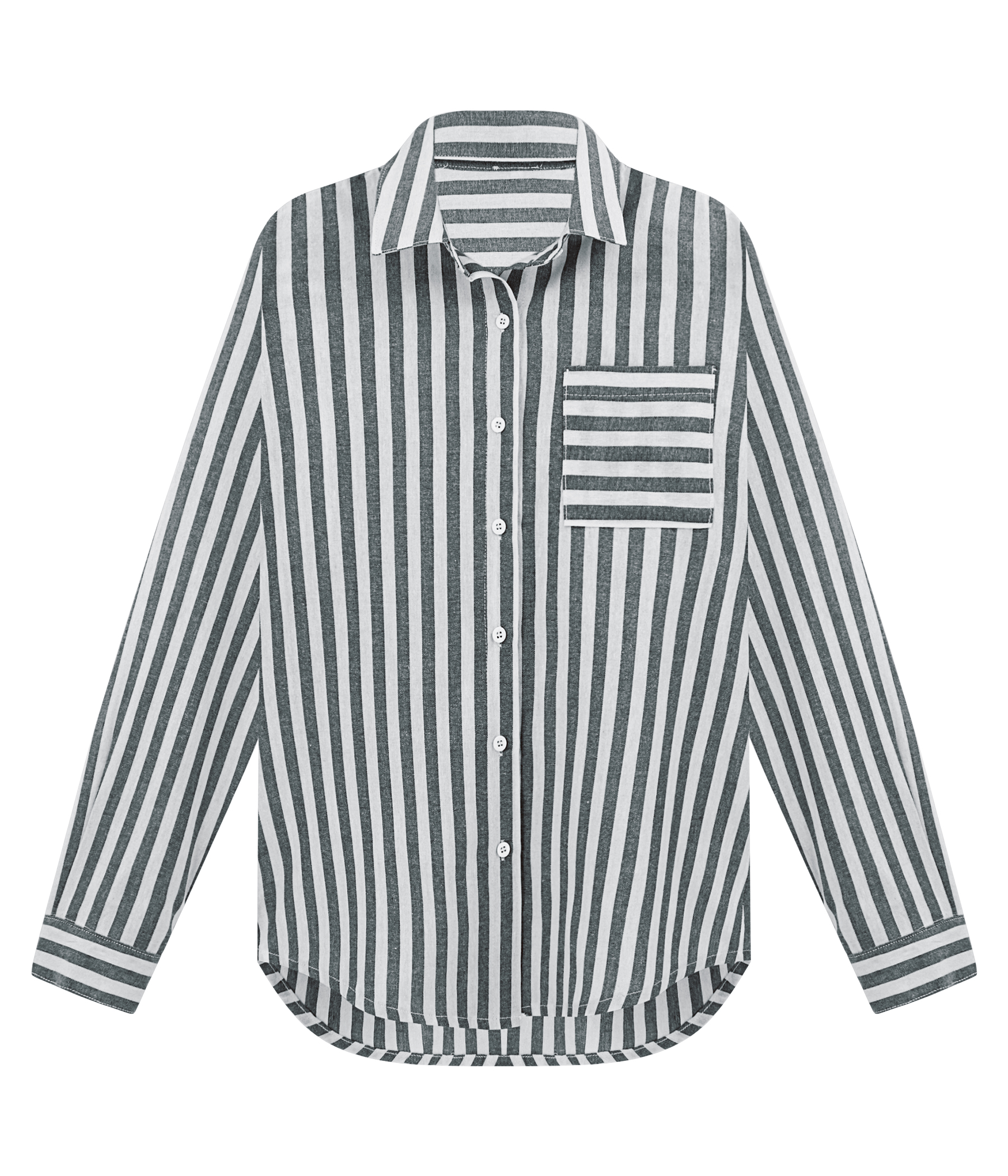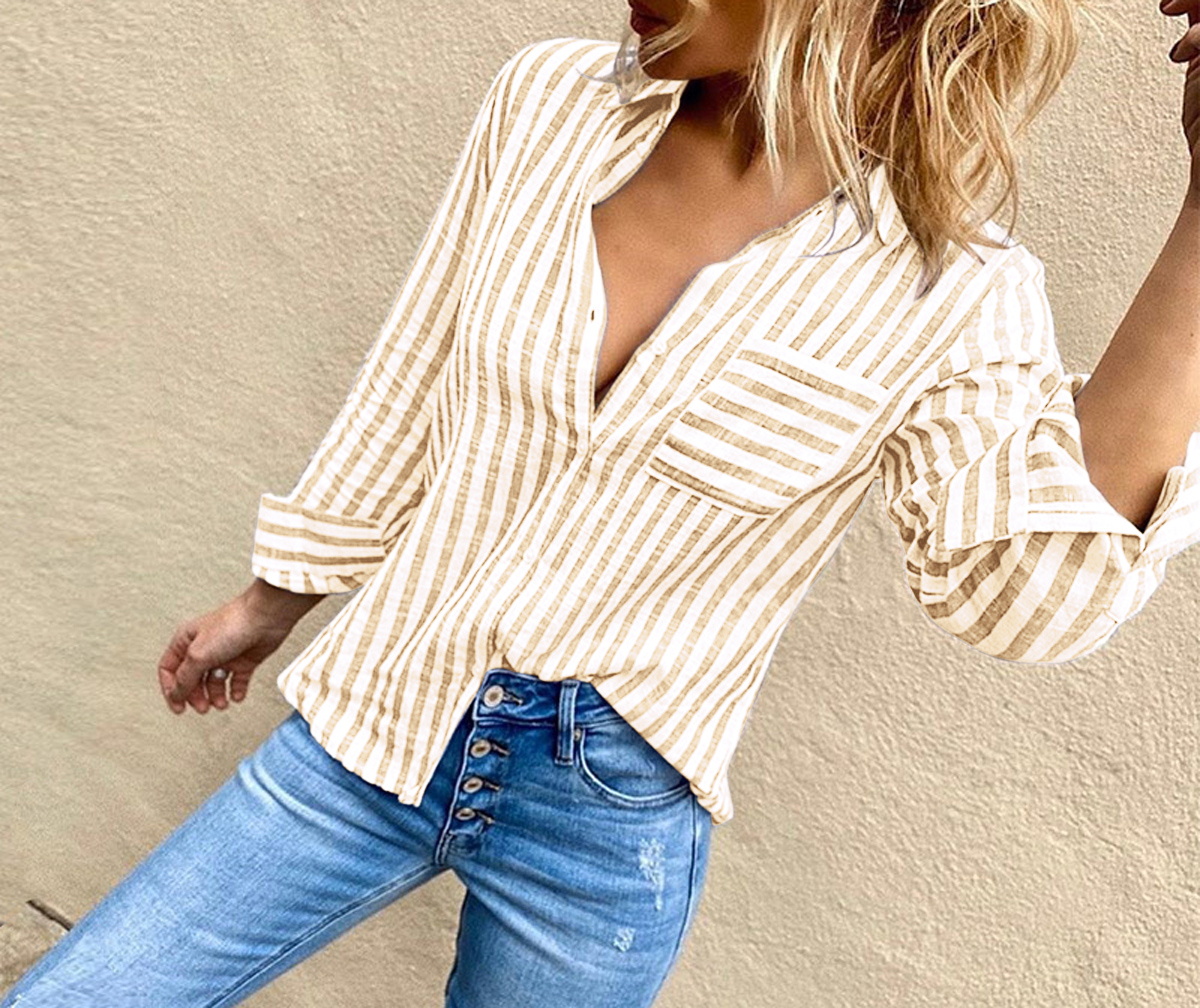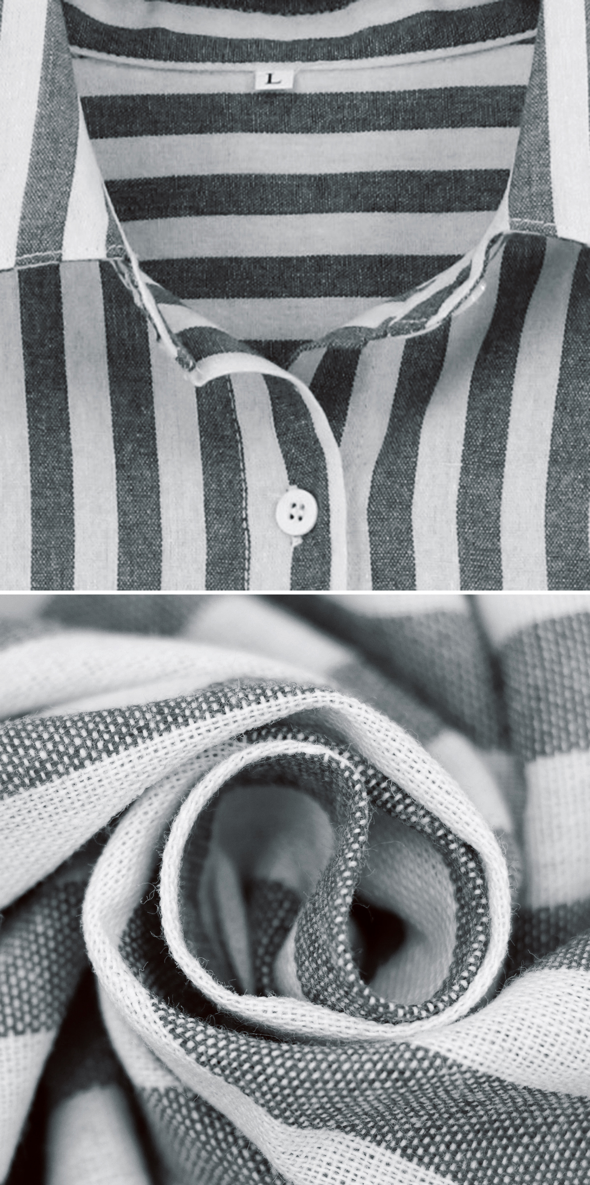 The striped shirt is a light and chic look. There are one pocket and two pockets two versions to choose from. Itself is a loose fit style which makes it extremely pleasant, suitable for anyone’s body type!