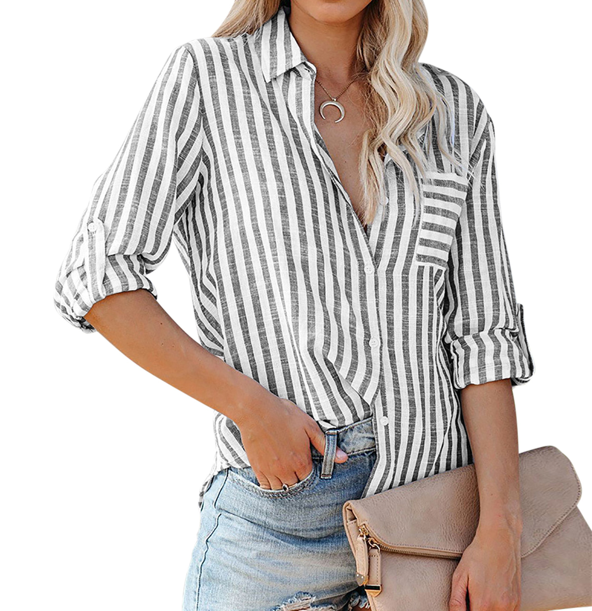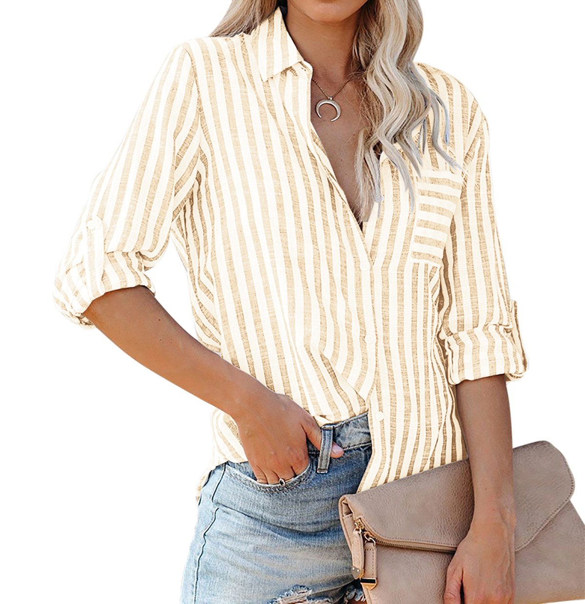 Why Choose R.Vivimos Women's Fall Cotton Long Sleeves Roll Up Striped Casual V Neck Button Down Shirts Blouses?