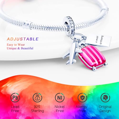925 Sterling Silver Charms Beads for Bracelets Necklaces, Airplane Passport Sister Heart Coffee Music Book Travel Pendant, Pink Color Cute Animal Jewelry Graduation Birth Gifts for Women Men