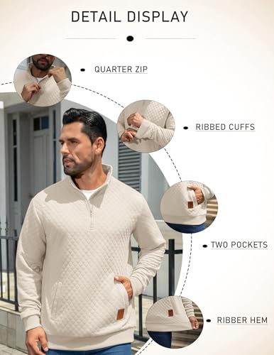 • Men's Casual Quarter Zip Pullover --- This mens quilted pullover features a half-zip design, making it flawless for both casual outings and more dressed-up events. The high neckline adds a touch of sophistication, and it includes a kangaroo pocket to hold small items like keys, a phone, a wallet, etc.