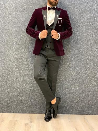 Tuxedo for Men 3 Piece One Button Blazer Double Breasted Vest Men Slim Fit Wedding Velvet Suit for Men Wedding with Tie 3