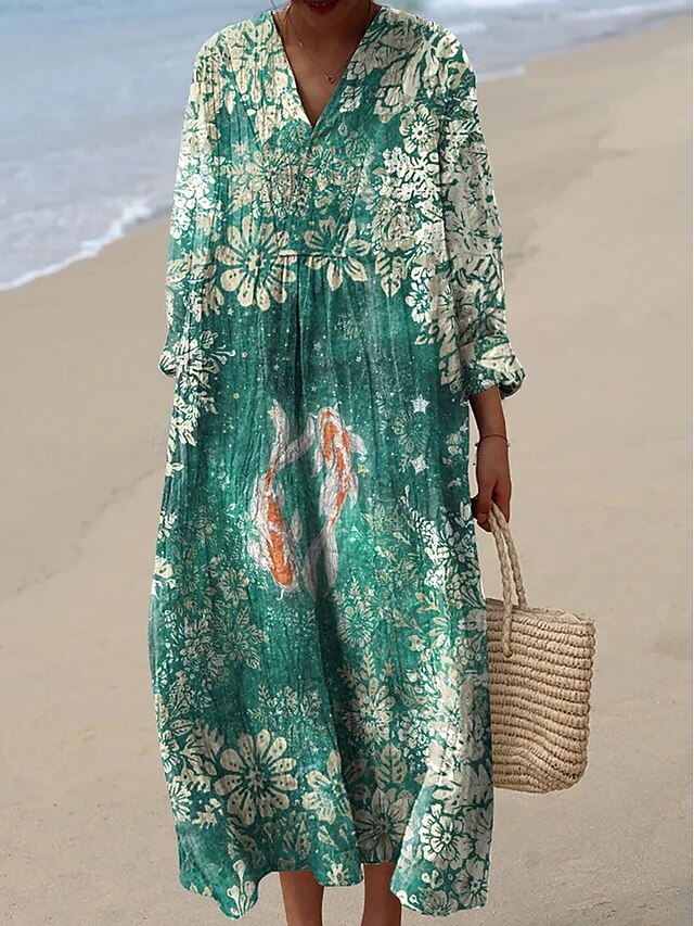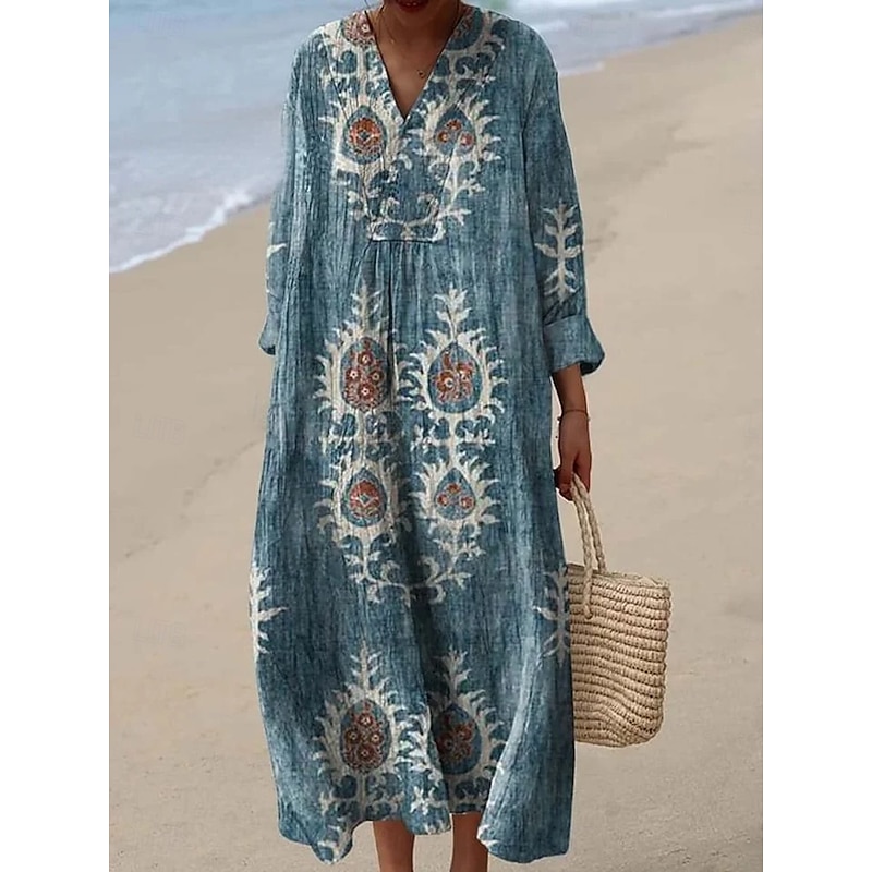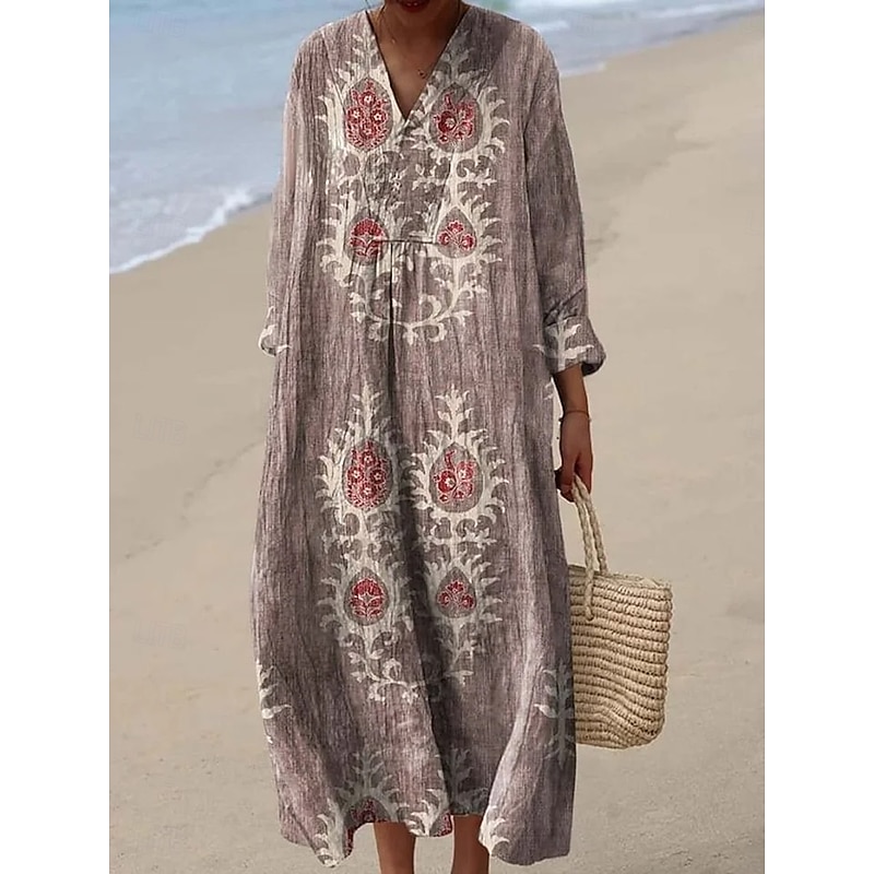 trending ! Women's Midi Dress V Neck Long Sleeve Kaftan Lightweight Loose Fit A Line Dress Casual Boho Going out Floral Graphic Long Sleeve V Neck claret Red Blue Light Purple Fall