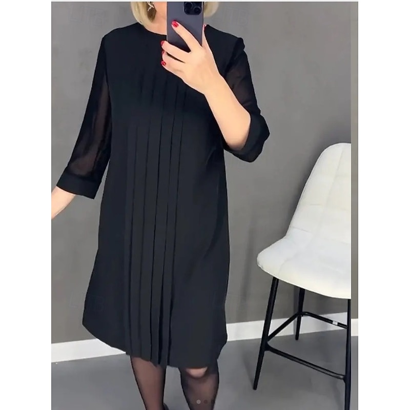 Featuring a combination of patchwork and shirred details, this dress is a blend of modernity and timeless elegance. The three-quarter sheer sleeves enhance the dress with a touch of sophistication, while the crew neck offers a clean and elegant neckline. Vertical pleats on the front add a structured look, enhancing its overall aesthetic appeal.