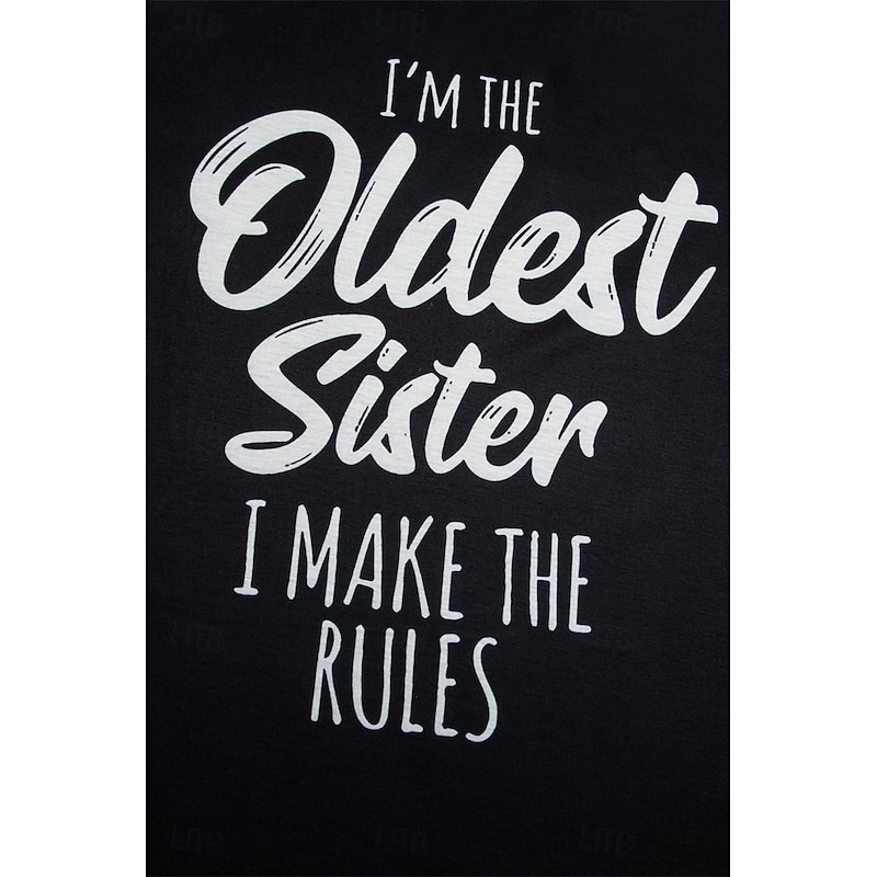 The T-shirt features a traditional round neck and showcases a bold letter print that reads "I'm the Oldest Sister, I Make the Rules," adding a humorous and personal touch. Available in various colors including black, blue, green, and pink, this top is both versatile and stylish.