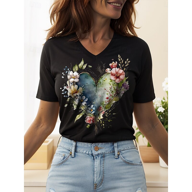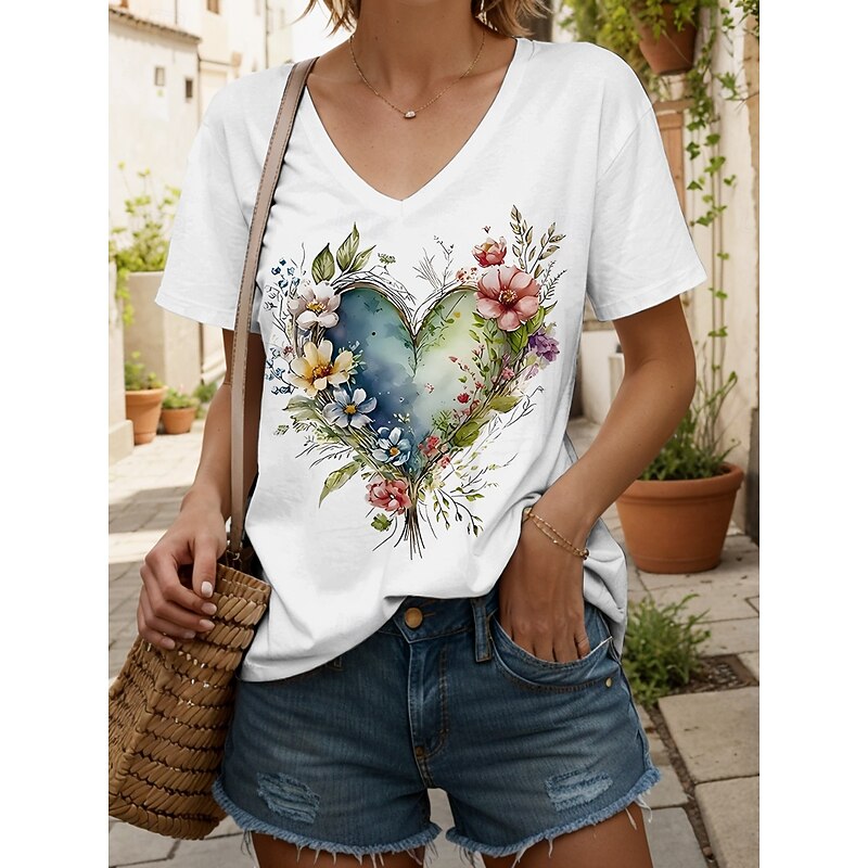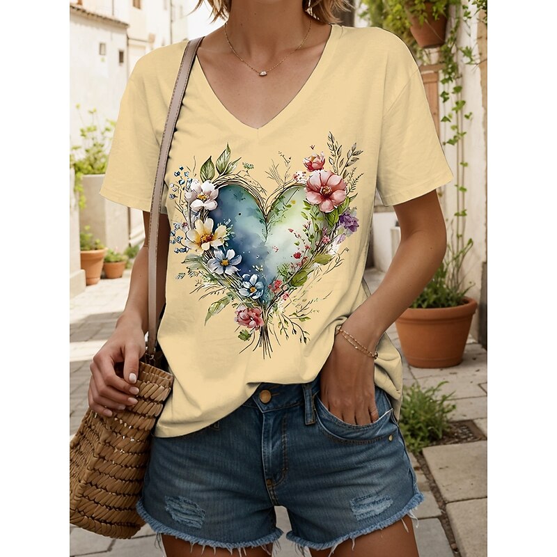trending ! Women's T Shirt Heart Floral Graphic Vintage Fashion Hawaiian Short Sleeve V Neck Regular Tops Daily Going out Weekend Print Black White Yellow Pink Blue Summer Spring