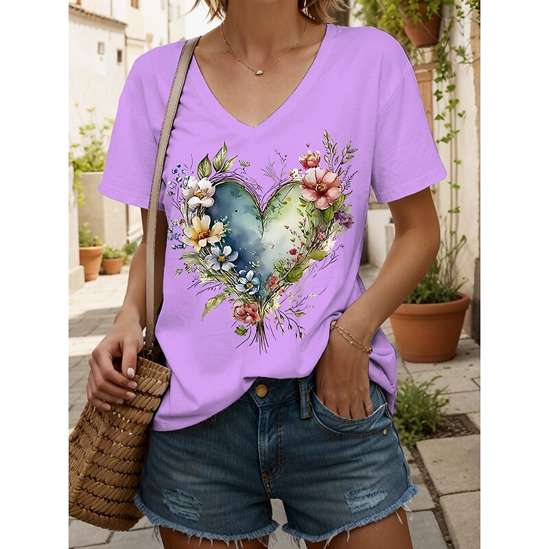 Women's T Shirt Heart Floral Graphic Vintage Fashion Hawaiian Short Sleeve V Neck Regular Tops Daily Going out Weekend Print Black White Yellow Pink Blue Summer Spring 12