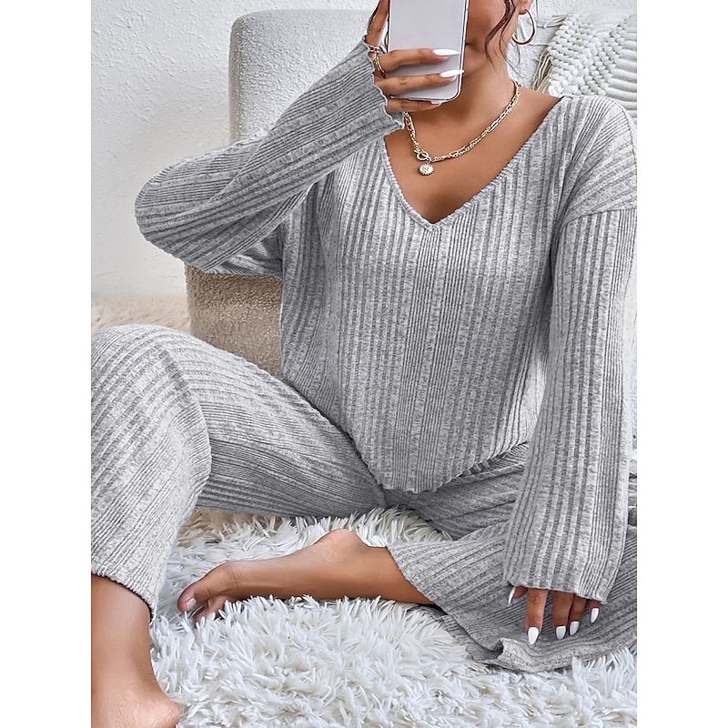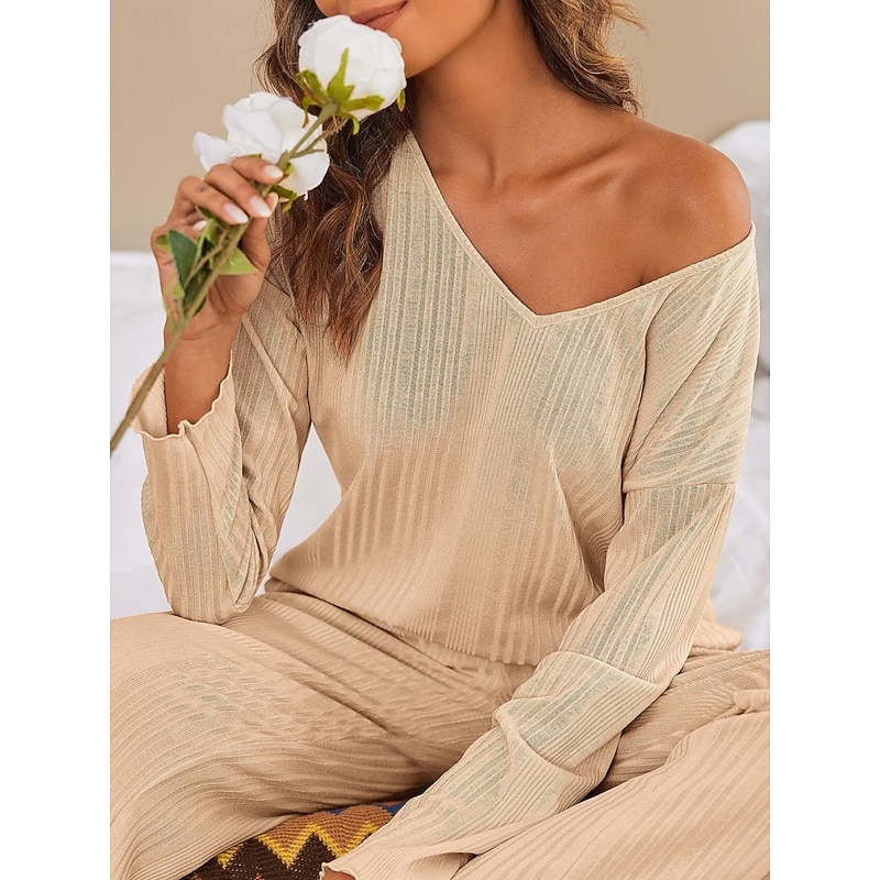 Why Choose Women's Pajama Set Casual Comfort Pure Color Elastic Waist T Shirt Pant Home Daily Long Sleeve V Neck Black Light Grey Beige Spring Fall Winter Regular Fit?
