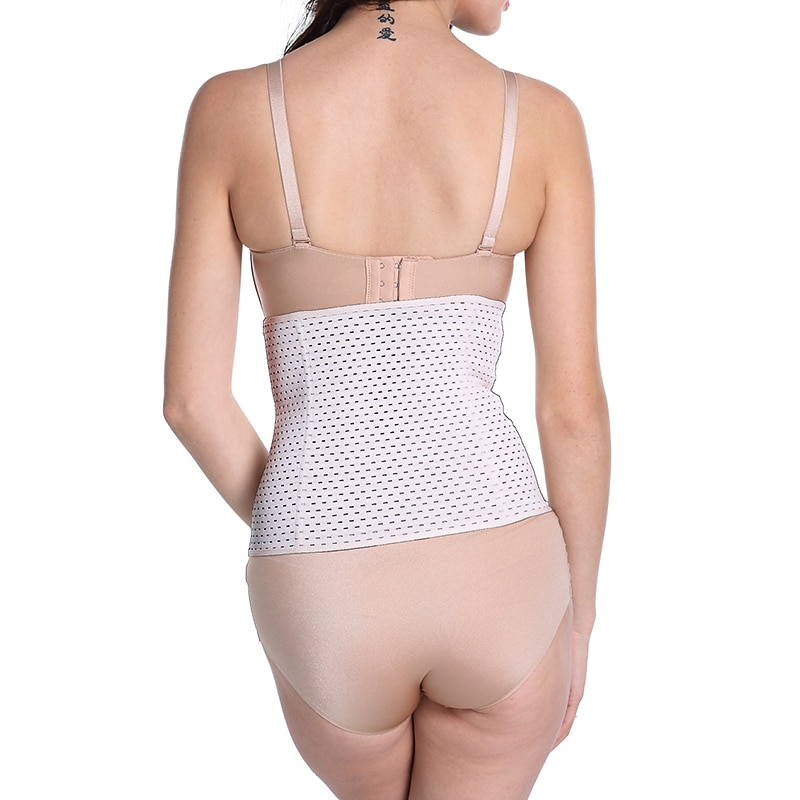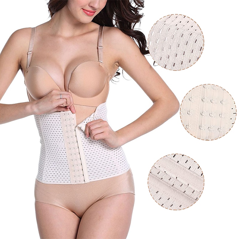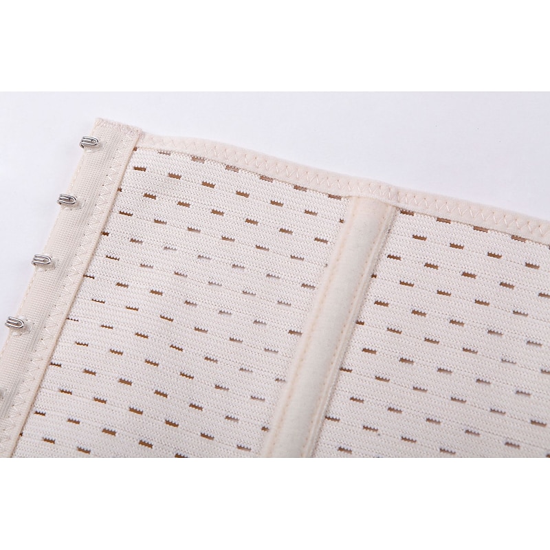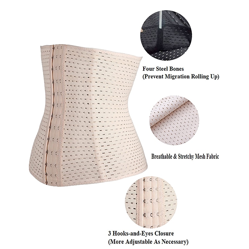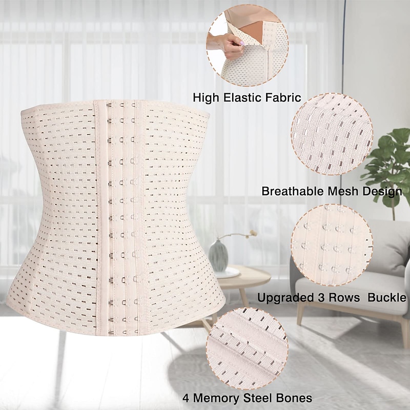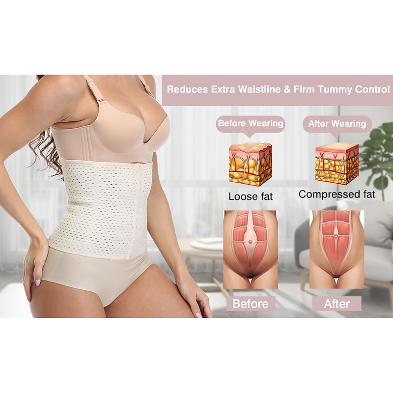 : Crafted from a breathable blend of spandex and polyester, this women's waist trainer offers a stretchy yet firm feel, ensuring both comfort and effective waist cinching. The fabric's light beige tone adds versatility, making it an outstanding choice for wearing discreetly under various outfits.