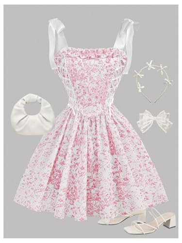 SHENHE Girl's Floral Corset Dress Lace Up Tie Shoulder Smocked Fit and Flare Flowy Sundress