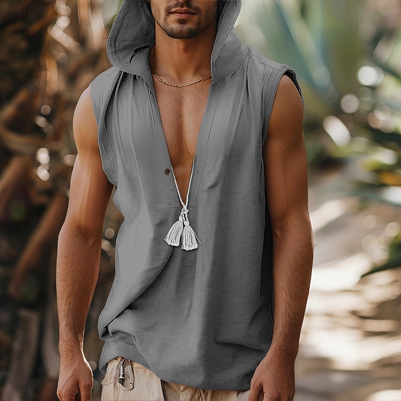 More information about Men's Shirt Linen Shirt Viking Style Popover Shirt Summer Shirt Beach Wear Solid Color Vacation Streetwear Black Navy Blue Blue Green Sleeveless Hoodie Summer Spring Clothing Apparel Hooded
