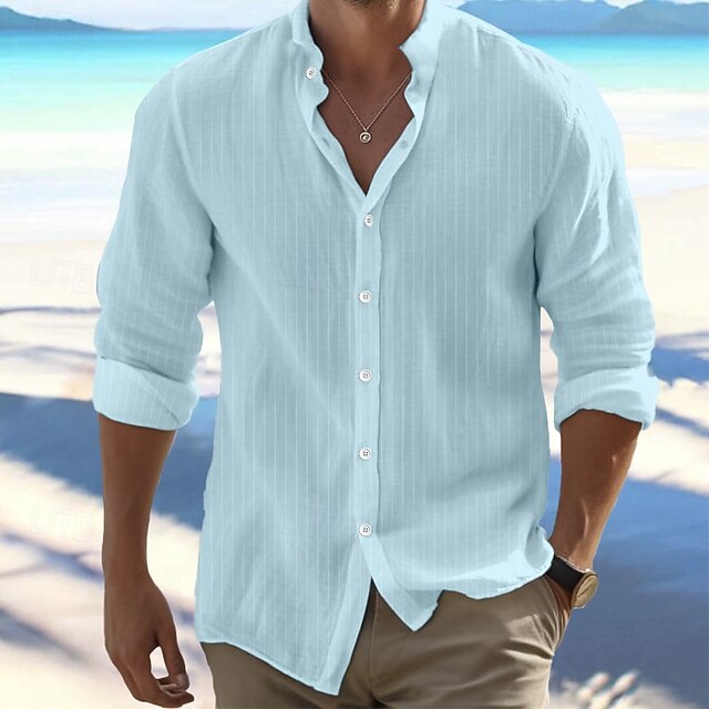 Why Choose Men's Shirt Linen Shirt Band Collar Shirt Summer Shirt Beach Wear Button Up Shirt Stripe Vacation Holiday Black White Blue Khaki Long Sleeve Band Collar Summer Spring Clothing Apparel?
