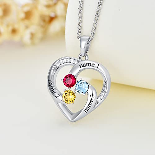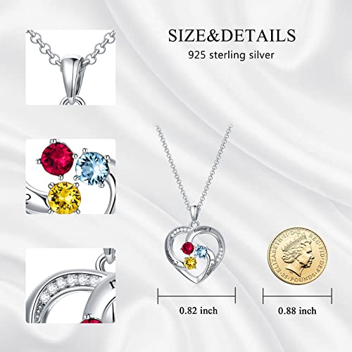 Custom Name Birthstone Necklace for Mom Sterling Silver Personalized Heart Name Necklaces for Women with 3 Birthstones Mother's Jewelry Gift for Mother's Day