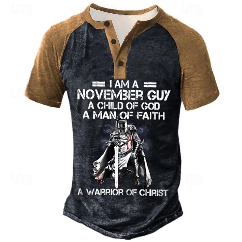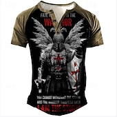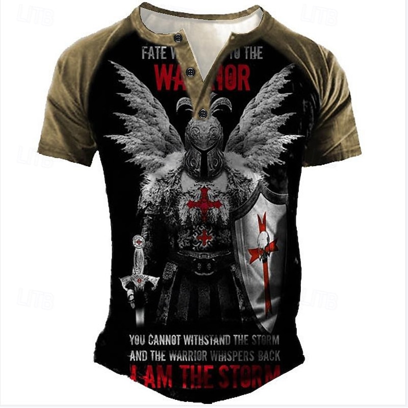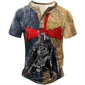 : Featuring a bold graphic of a medieval knight adorned with a Templar cross, this T-shirt combines historical inspiration with modern style. The 3D print design adds depth and visual appeal, while the patchwork and button-down elements offer a special and modern touch.