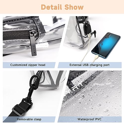 • 【Upgraded Design】Clear Sling Bag is made of waterproof and wearable PVC fabric, smooth and light, with a USB port, so you can feel cushy enjoying music even when running or exercising! And with a sturdy buckle, not easily damaged, but also adjustable shoulder strap length, more in line with your body shape, more comfortable to carry.
