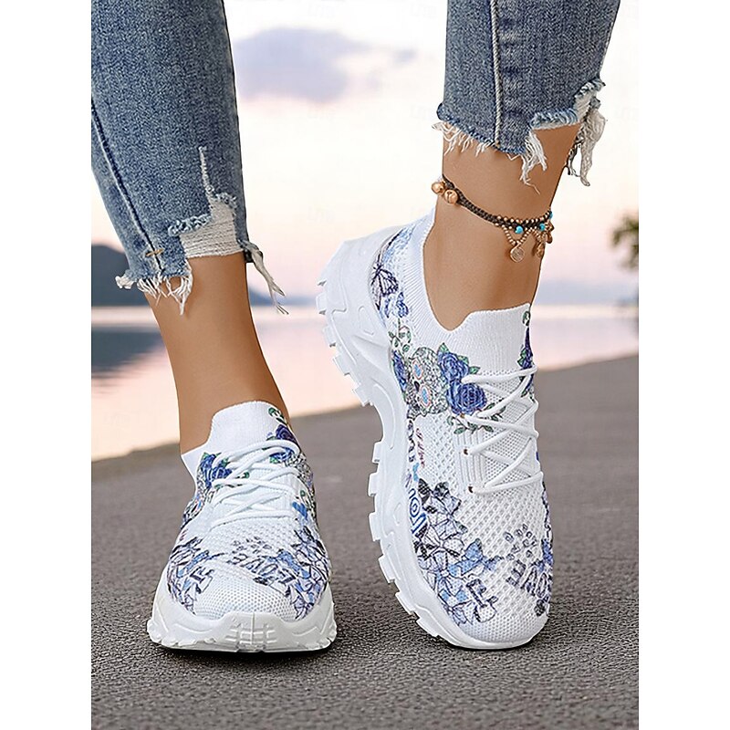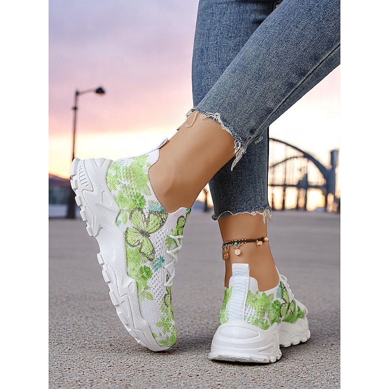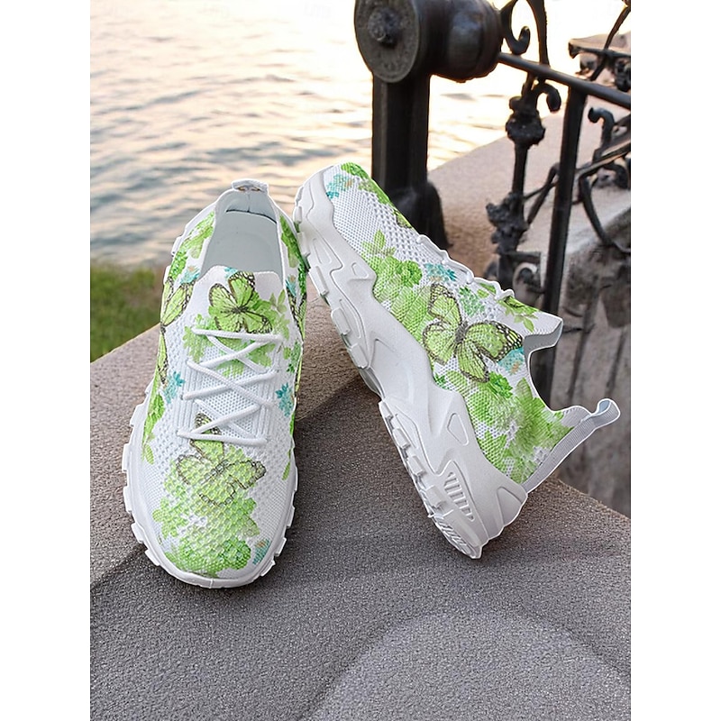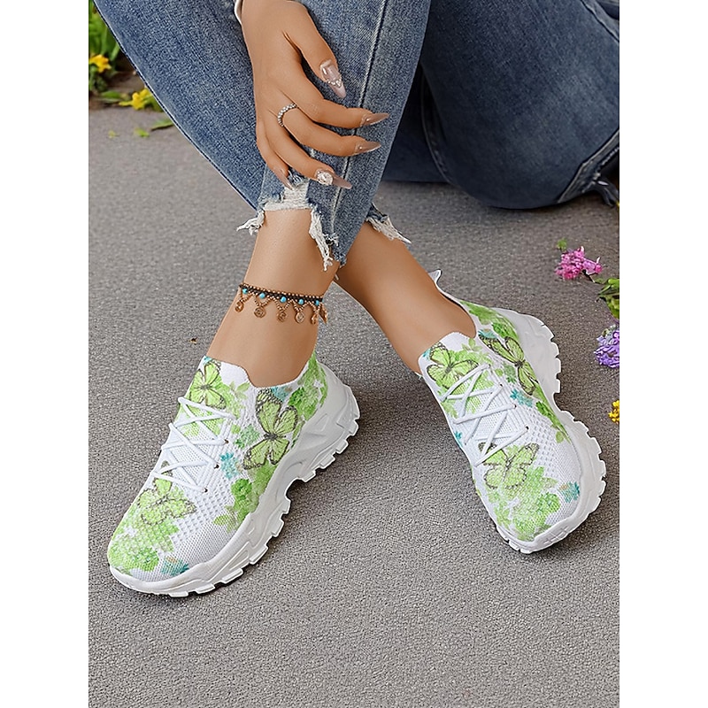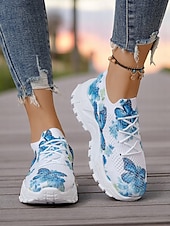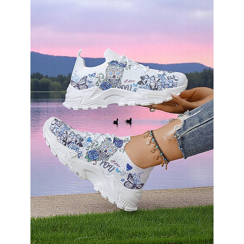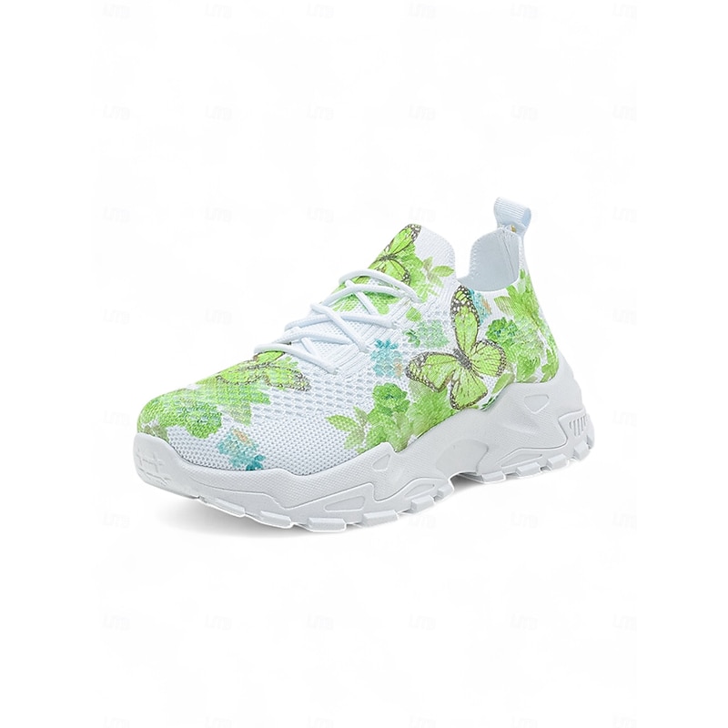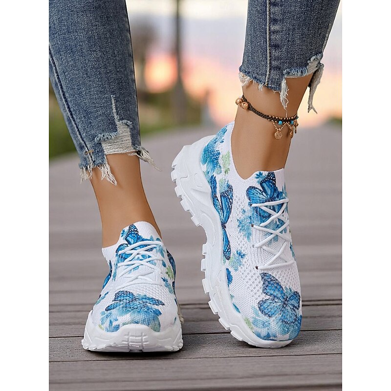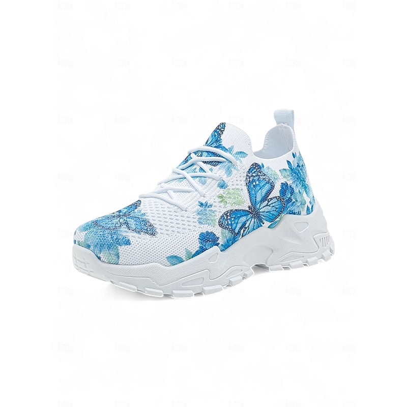 trending ! Women's Flyknit Sneakers with Blue Butterfly Print – Fashionable Lightweight Trainers for Walking, Casual Outings and Travel