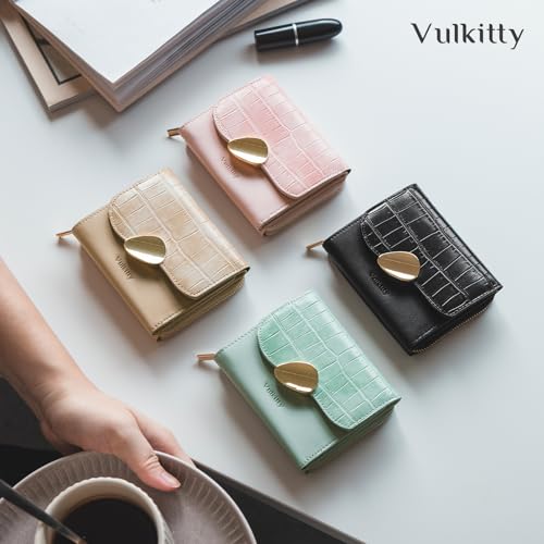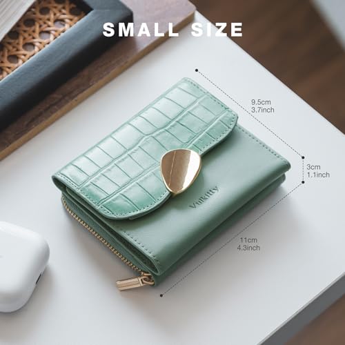 Brand: VulkittyColor: GreenMaterial: Faux LeatherStyle: TrifoldPattern: SolidCompact and Stylish: Vulkitty small purse designed for women, perfect for carrying your essentials on the go.Security: With the built-in RFID/NFC blocking material, the leather purse protects your credit cards and personal information from unauthorized scanning.Organized Storage: A zipped pocket with two compartments for coins, AirTag, lipstick, and other women's accessories; a bill compartment; a total of 6 card slots including a clear window slot for ID/driver's license.Fashion Design: Crafted from high-quality soft leather and crocodile-print leather with a leaf-format buckle, ensuring durability and a luxurious feel.Perfect Gift: Ideal gift for women of all ages, suitable for any occasion and sure to impress Perfect for everyday use. High quality materials and excellent craftsmanship ensure long-lasting durability.