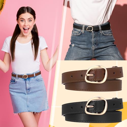 trending ! Women Leather Belt for Jeans Pants, 2 Pack Casual Waist Belt with Gold Buckle Fashion Ladies Waist Belt for Dresses,Jeans,and Shorts