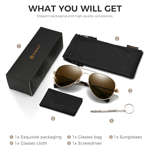 Origin: ImportedBrief content visible, double tap to read full content. Full content visible, double tap to read brief content. Bundles with this item Previous page Sungait Aviator Sunglasses & Portable Sunglasses Case -7% $27.88 Was: $29.98 Next page See all bundlesTimeless Aviator Design: These aviator sunglasses feature the classic aviator style that never goes out of style, perfect for both men and women seeking a chic and sophisticated look, , suitable for all face shapes and unisex in styleHigh-Quality Gold Frame: Crafted with a durable gold-toned metal frame that offers a luxurious feel and a comfortable fit for all-day wearHD Polarized Lenses: Equipped with polarized lenses that reduce glare and protect your eyes from harmful UV rays, ensuring clear vision and comfort in bright sunlightNose Pads for Comfort: Designed with adjustable nose pads to provide a custom fit and prevent slipping, even during active useDurable and fashionable: The combination of style and durability makes these sunglasses an excellent accessory for any occasion, from casual outings to formal eventsLightweight & Comfortable: Fit comfortably for extended wear. Ideal for driving, running and other outdoor activities. Perfect for everyday use. first-class materials and excellent craftsmanship ensure long-lasting durability.