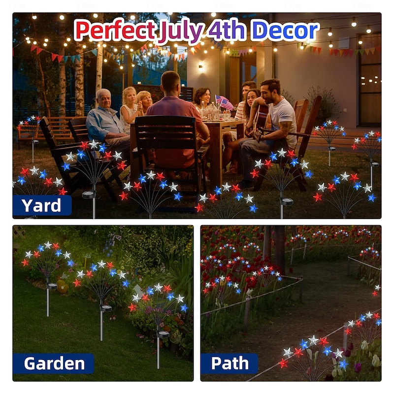 This 2 Pcs 9 Heads outdoor solar waterproof red, white, blue tricolor pentagram ground mounted lights, July 4th, USA Independence Day courtyard garden lawn patriotic party decoration lights combines elegant design with practical functionality. Every detail has been carefully considered to ensure you get the best possible experience. The superb construction means this product will serve you well for years to come.