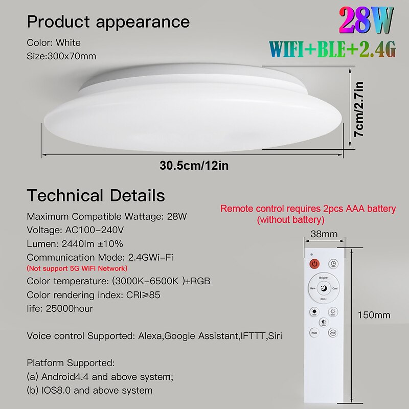 This Smart LED Ceiling Lamp 12In 28W Front comfortable White Light and Back RGB Color Changing Embedded Bedroom Lamp App and Voice Control Timing Compatible with Alexa Google Home AC100-240V combines elegant design with practical functionality. Every detail has been carefully considered to ensure you get the best possible experience. The superior construction means this product will serve you well for years to come.