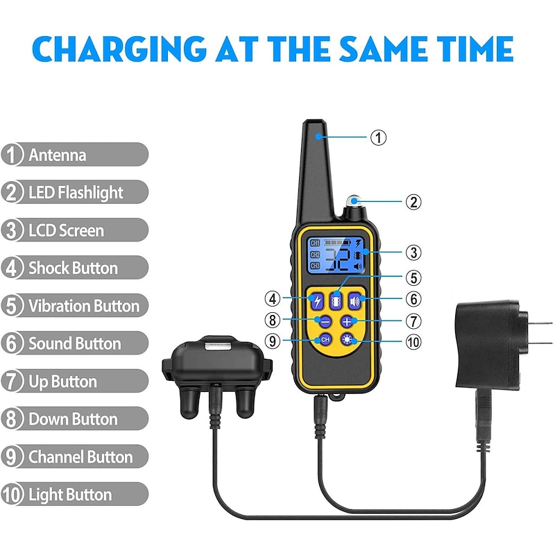 Highlights ☛Features: ★4 Modes: vibration/ shock/ LED light/ beep mode, 1-99 adjustable intensity levels for Shock and Vibration ★100% IPX7 Waterproof ★Remote control range: Up to 800 yards in open spaces (If there are obstacles around the range may be reduced to about 330 yards). ★This remote shock collar for dogs can fit almost all size dogs. Collar strap is adjustable from 7-26 inches. Shock collar for small dogs and shock collar for large dogs. ★Rechargeable Lithium Batteries for Collar Receiver and Remote Transmitter can be charged at the same time. ★LCD Display featuring a Blue Back Light for nighttime usage ★Flashlight on Receiver helps to find your dog easily in low brightness environment ★There are 3 signal channels on the remote transmitter, and it can control 3 receivers of the same model. ☛Package includes: - 1 x Remote Transmitter - 1 x Collar Receiver - 1 x Adjustable Belt - 1 x USB Charging Cable - 1 x Charger - 1 x Test Bulb - 2 x Sets Contact Points - 1 x User Manual Tips: In purchase to ensure the normal use of the dog trainer, please use it after charging. Please unplug the power supply in time after charging.