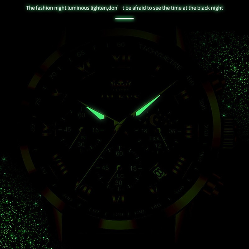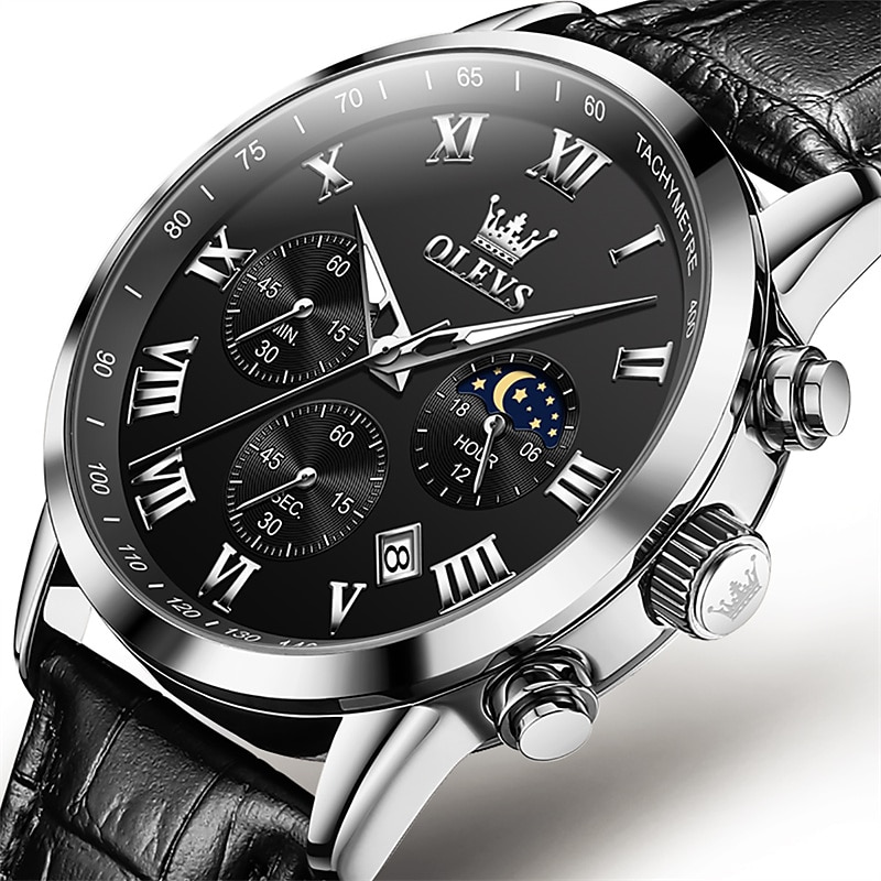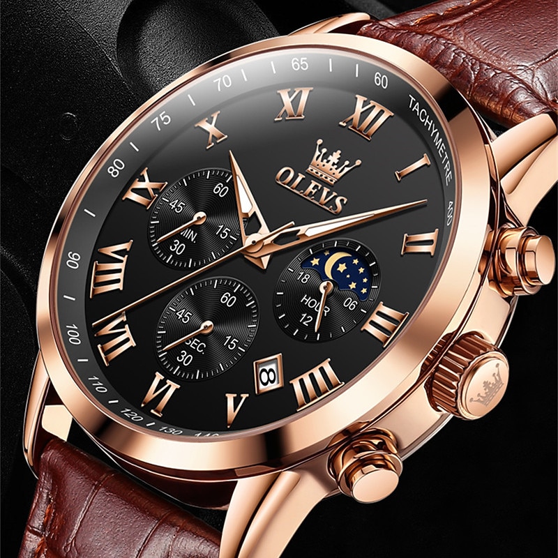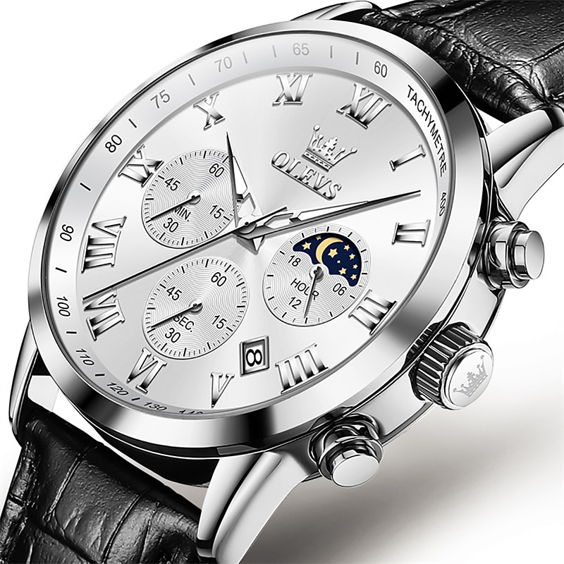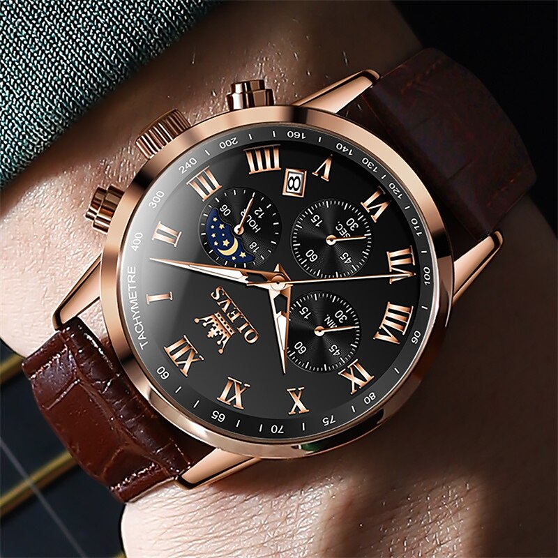 trending ! OLEVS Men Quartz Watch Sports Waterproof Moon phase Luminous Calendar Chronograph Genuine Leather Watch