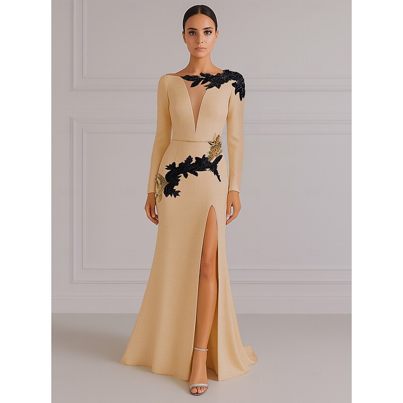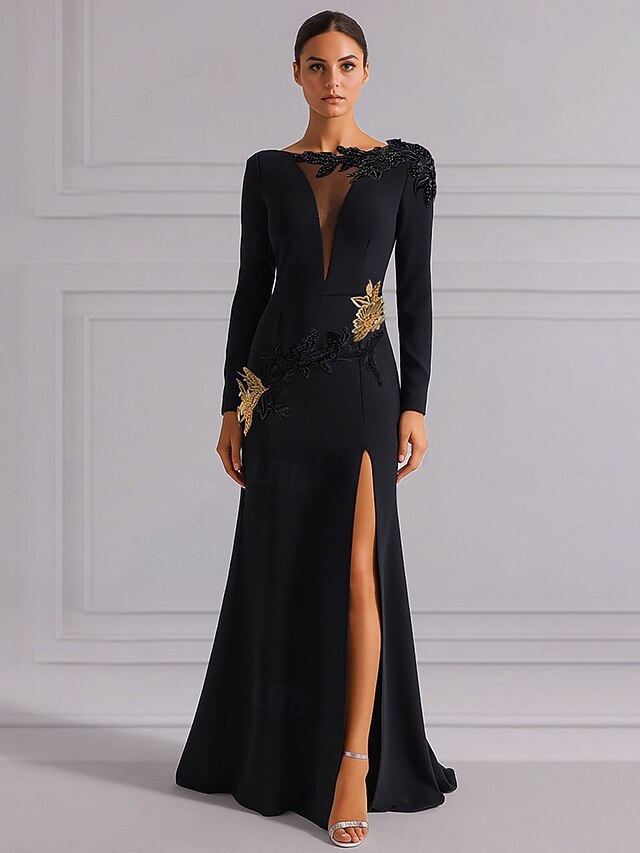 trending ! Black and Gold A-Line Evening Gown Elegant Dress Formal Tuxedo Dress Wedding Sweep / Brush Train Long Sleeve V Neck Stretch Crepe with Sequin Embroidery