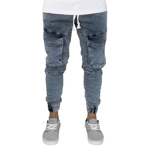 Jeans Pants Trousers Denim Stretch Slim Fit Trendy Washed Blue Sanding Fading Elastic Waistband Ankle for Men