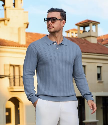 Mens Knit Polo Shirt Regualr Fit Lightweight tender Casual Long Sleeve Striped Golf Polo Shirts