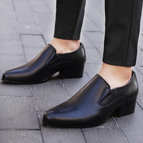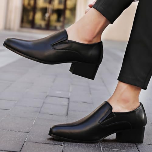 Men's Genuine Leather Chunky Heel Dress Loafers Fashion Classic Pointed Toe Low Top High Heel Slip On Oxford Shoes Casual Business Office Wedding Formal Shoes 6